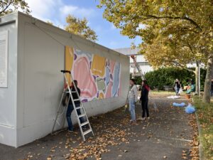 > Mise en place de bâches colorées pour égayer les modulaires,